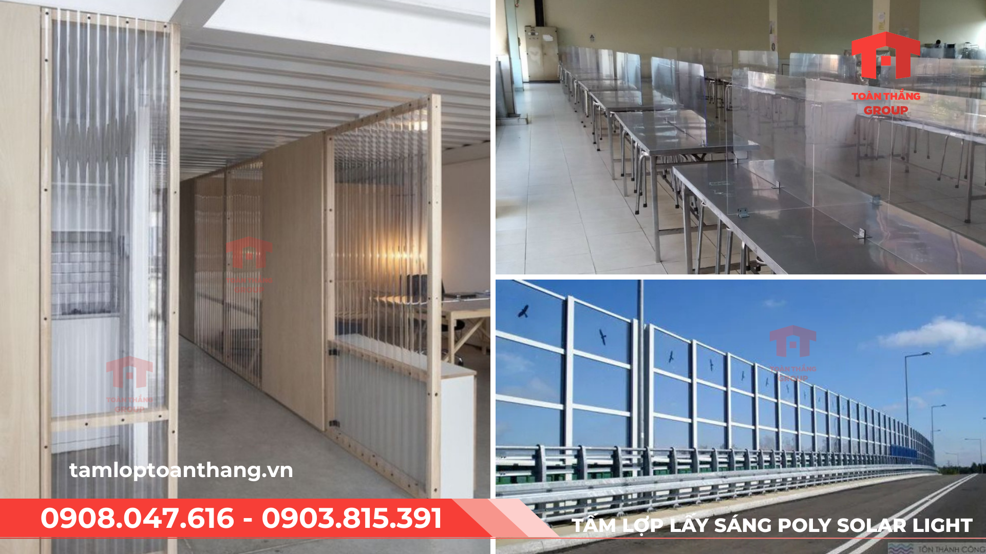 Các hạng mục này giúp công trình thông thoáng, tiết kiệm năng lượng và tăng tính thẩm mỹ. Tấm polycarbonate dễ uốn cong, phù hợp nhiều kiểu dáng lam và vách ngăn hiện đại. Nhờ tính linh hoạt, vật liệu này còn giúp thiết kế nội thất và ngoại thất trở nên sáng tạo hơn.